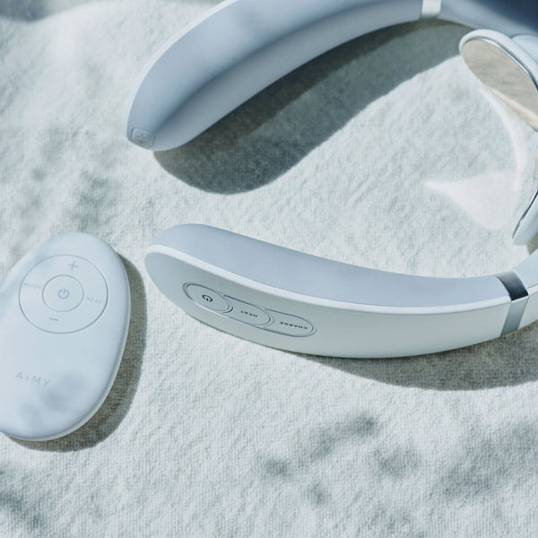 首にかけて手軽に使える「エイミー ネックマッサージャー」。疲れがたまりやすい首と肩を、温めながら心地よくほぐします。多彩な機能がうれしい、医療機器認証取得の本格マッサージャーです。