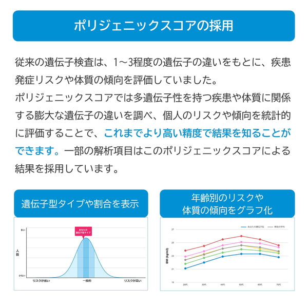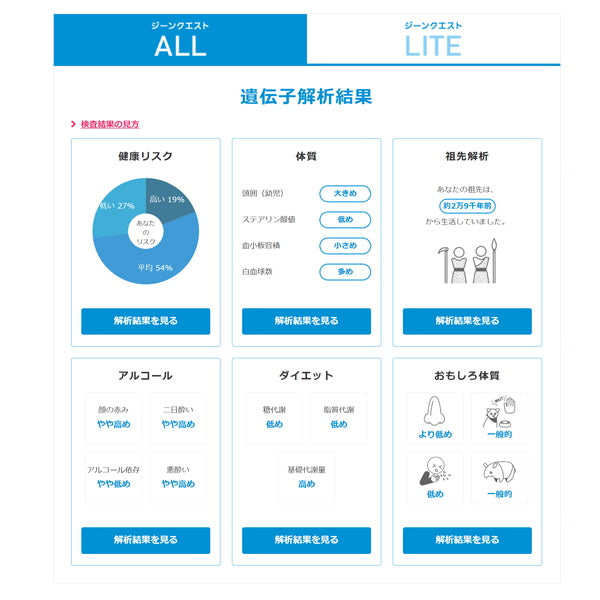 ・解析結果は遺伝的な傾向をお伝えするものです。現在の健康状態については医療機関へご相談ください。