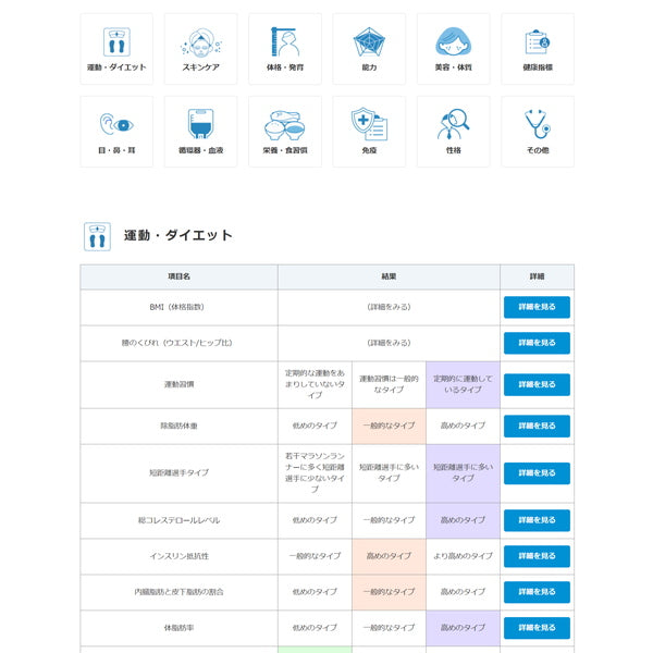 さらに、肥満の傾向やアルコール分解能力など、気になる体質もくわしくチェックできます。
