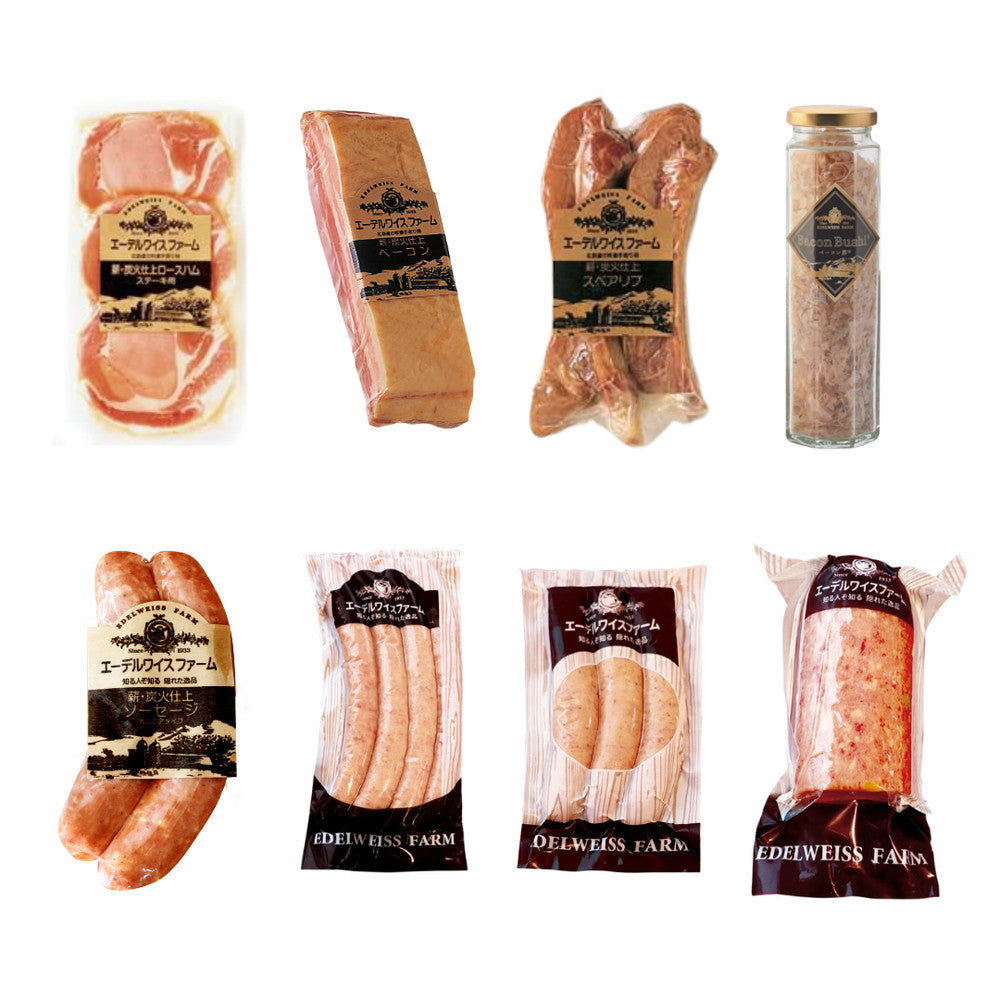 ■商品内容:北海道・誕生90余年 長期氷温熟成製法 「エーデルワイスファーム」薪・炭火仕上げべーコン・ソーセージギフト F