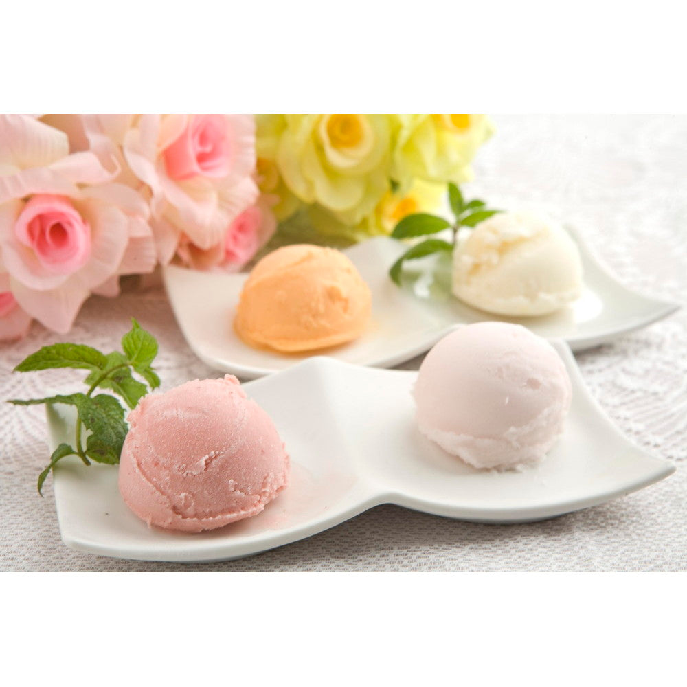 産地自慢の国産果汁を使用してアイスを作りました。「あかい」 「まるい」 「おおきい」 「うまい」と四拍子そろった福岡県産あまおう苺を使ったソルベ。北海道産赤肉メロンの甘味と香り豊かでクリーミーな、メロンジェラート。岡山県産清水白桃の果汁を使い、まろやかな甘味がうれしいソルベ。