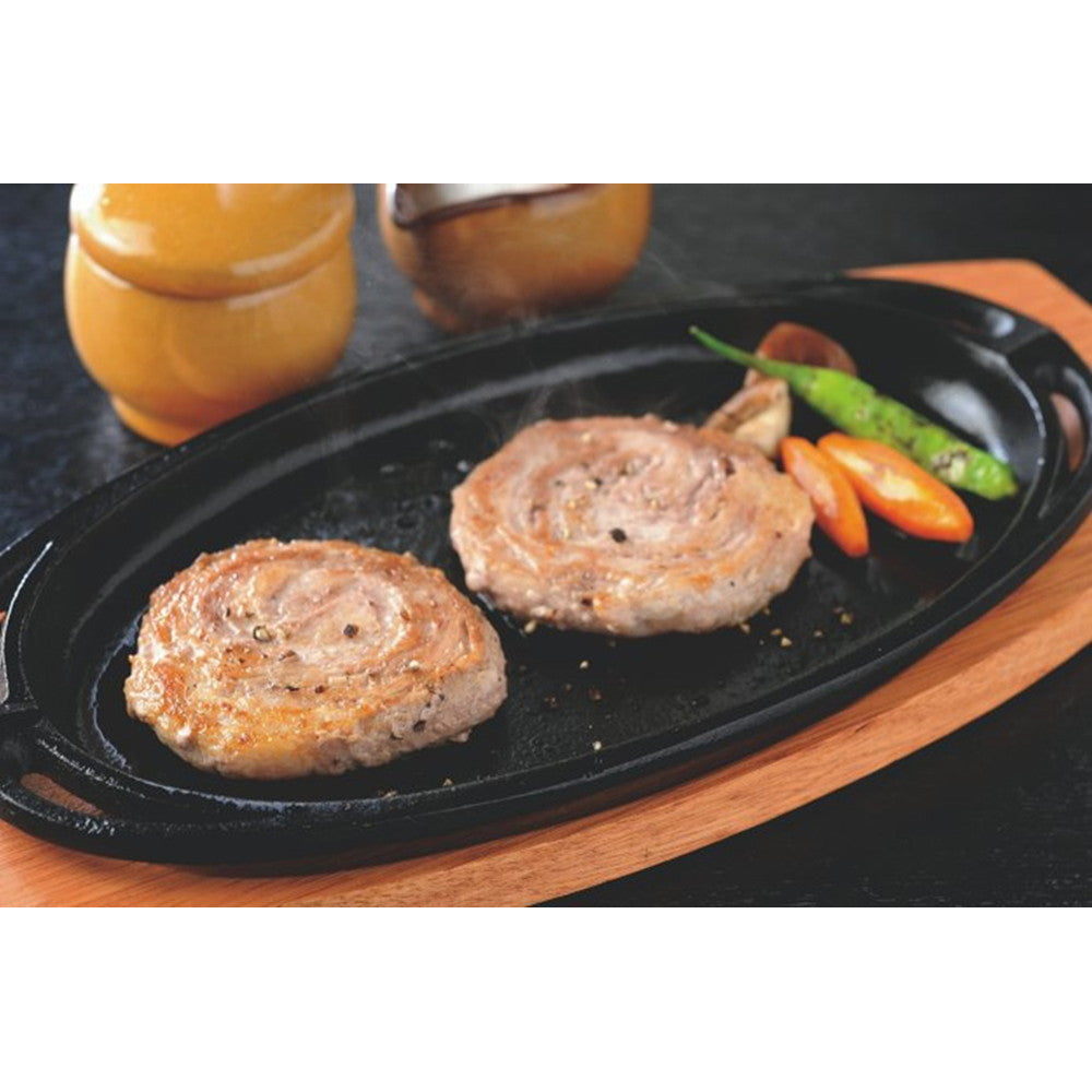 歴史は古く、戦国時代より島津藩(今の鹿児島県)で肥育されていた豚が起源で、現在では純粋バークシャー種のみと定められています。肉質は、光沢のある淡灰紅色で、弾力性と歯切れが良く、臭みが無く、ほのかな甘みが特徴です。お箸で切れるほど柔らかなロールステーキをご賞味ください
