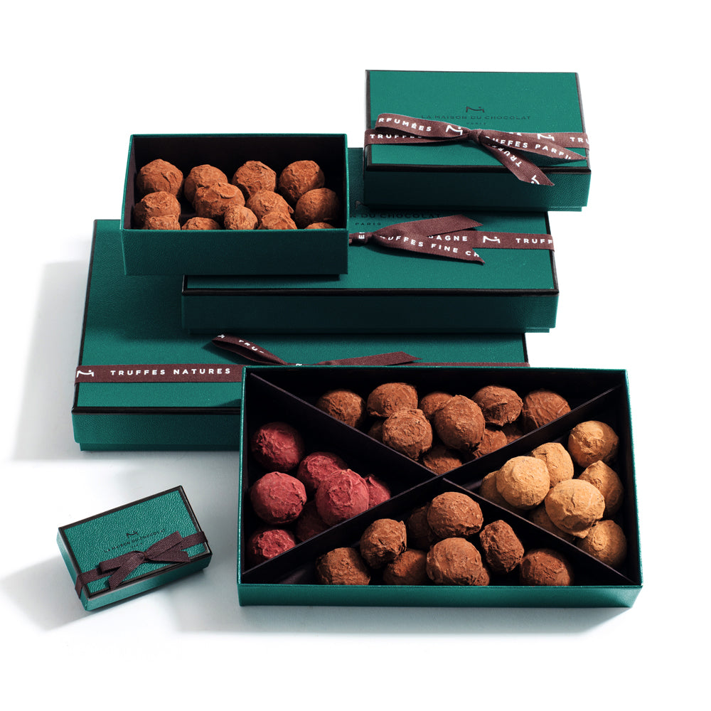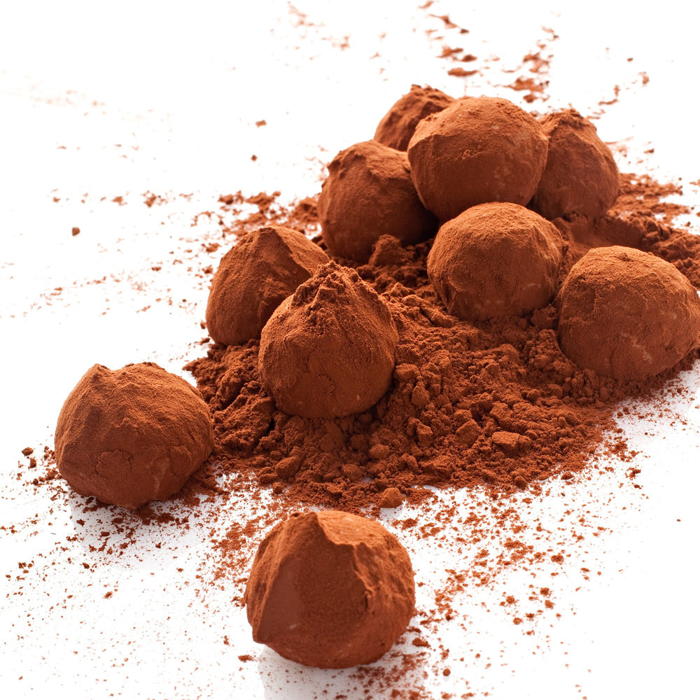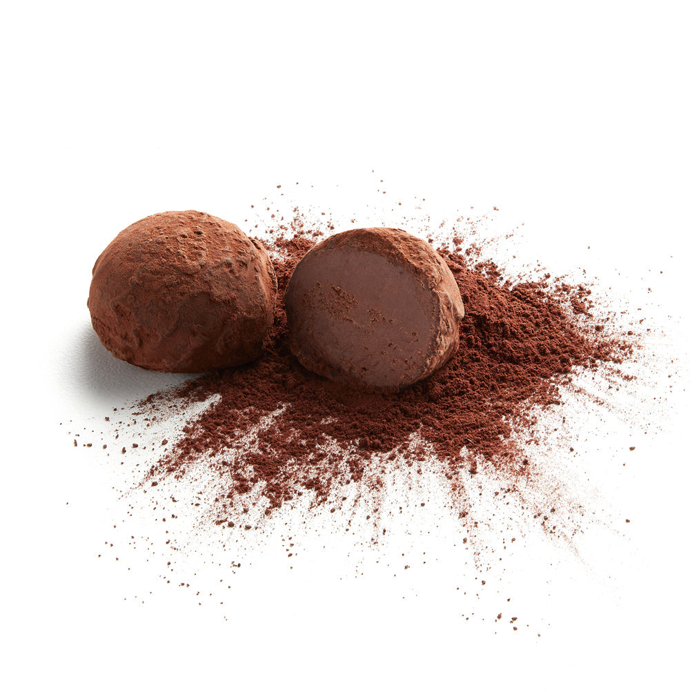 ■濃厚でとろけるようなガナッシュムースをダークチョコレートでコーティングし、ほろ苦いカカオパウダーをまぶしたトリュフ。約13粒入。