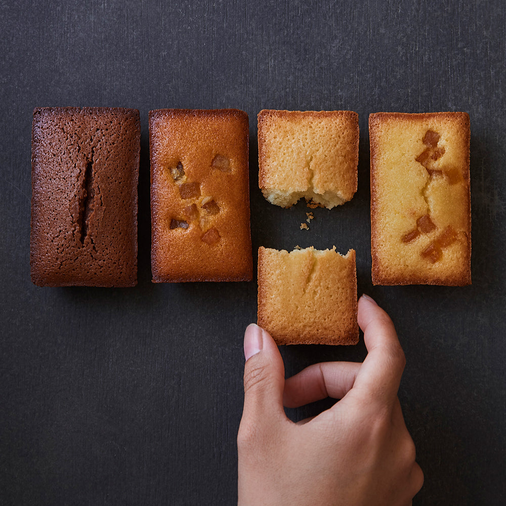 ■アーモンドプードルの風味豊かなナチュール、ガトーショコラのような濃厚な味わいのショコラ、オレンジコンフィを混ぜ込んだオランジュとオランジュキャラメル、合計4種類をたっぷりお楽しみいただける詰合せ。