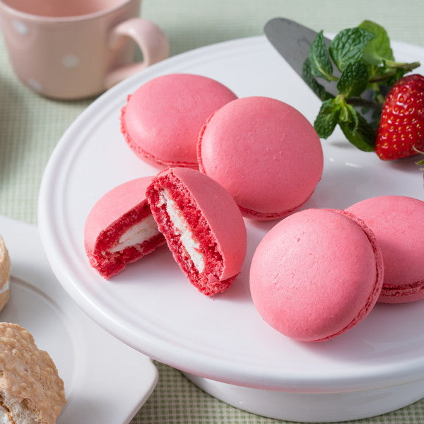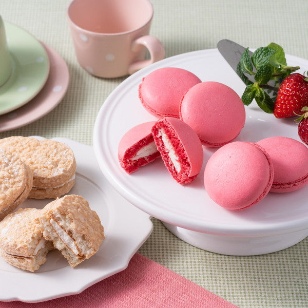 杏仁の風味の香る、外はサクサク食感、中はしっとりクリーミーなダックワーズにオリジナルのふんわりとしたいちごミルククリームを色鮮やかでサクッとした生地ではさみこんだマカロンとあわせてお届けします。