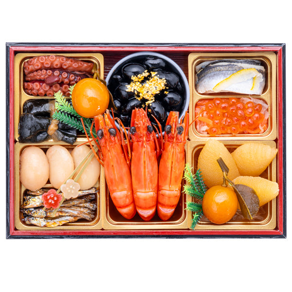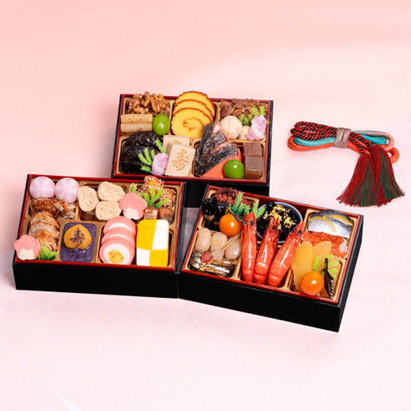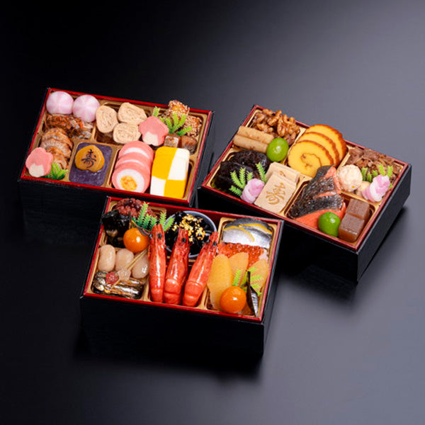 小さな重箱いっぱいに選びぬかれた食材を盛り、華麗で存在感のある三段重です。