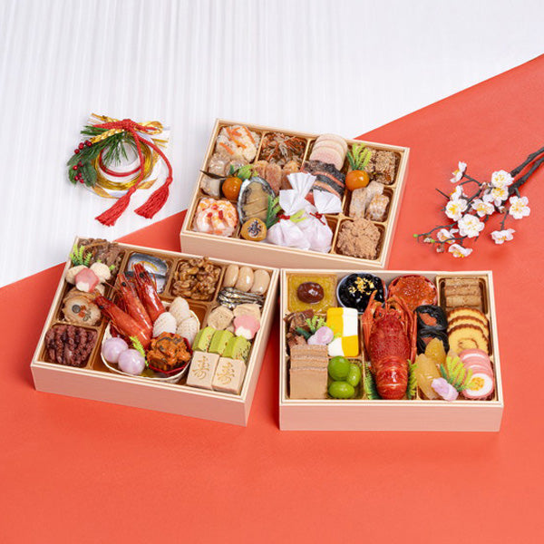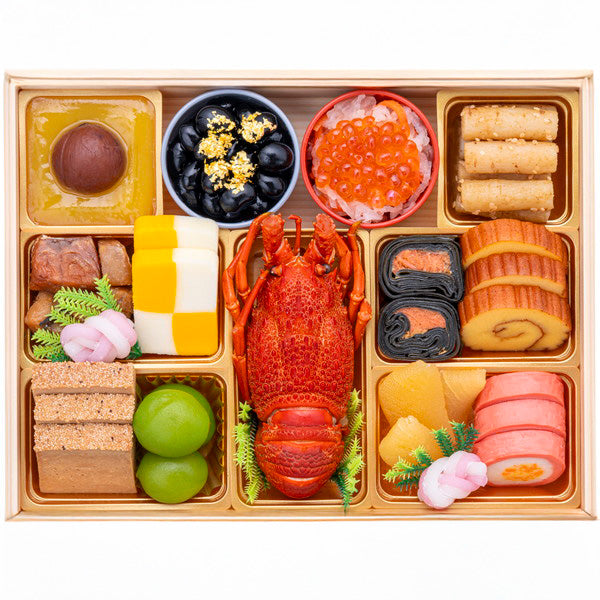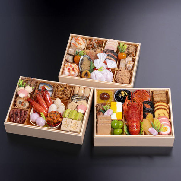 明るい木目柄の重箱に、ロブスター、 あわびといった高級食材をは じめ、世代を超えて楽しめる品々を盛り込みました。 大きすぎず物 足りなさもない、 「ほど良いサイズ」 に仕上げています。
