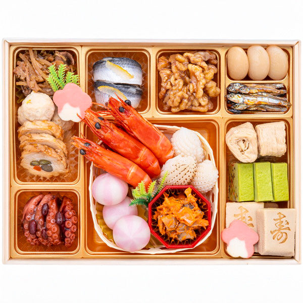 上品な木目柄の重箱には、こだわりぬいた食材をそれぞれの鮮やかな色彩が映え、初春の食卓を明るく晴れやかに印象を付けます。
