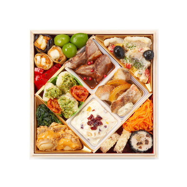 金箔黒豆,田作り,栗きんとん,鰤塩麹焼,かつをくるみ,鶏の柚子味噌焼,市松かまぼこ,豚八幡巻,手まり麩,鰊昆布巻,数の子美味漬,浜汐海老,伊達巻
