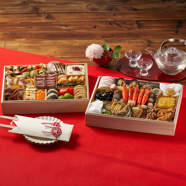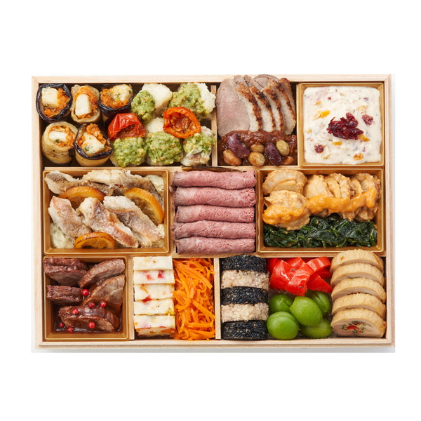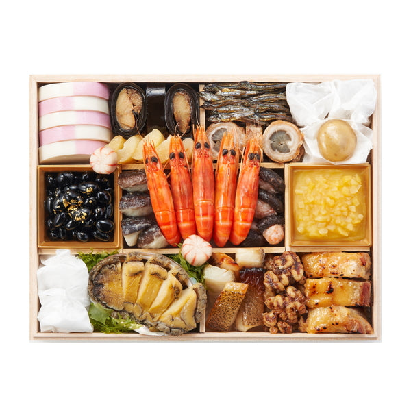 市松かまぼこ, 鰊昆布巻, 手まり麩, 数の子美味漬, 田作り, 琥珀ふくさ包み, 豚八幡巻, 金箔黒豆, 裏白しいたけ, 浜汐海老, 海老しいたけ, 栗きんとん, 煮あわび, カラスガレイ西京焼, かつをくるみ, 鶏の柚子味噌焼