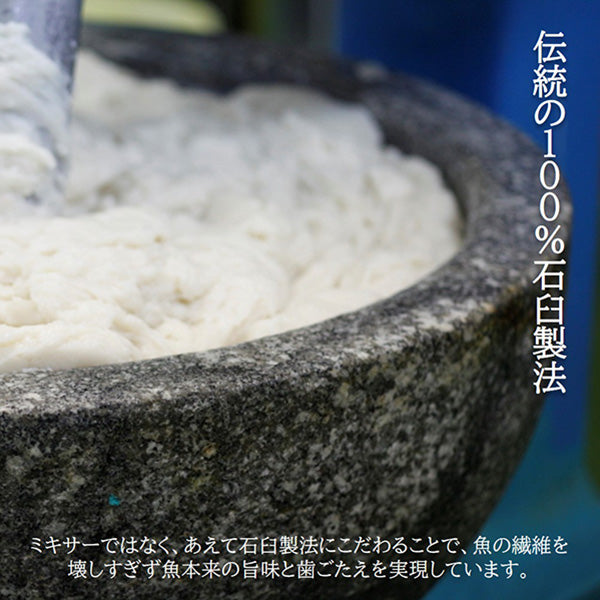 あえて手間のかかる昔ながらの石臼造りのこだわり、魚肉の繊維を壊さず魚肉本来の旨みや甘味を大事にし、丹念に練り上げてます。