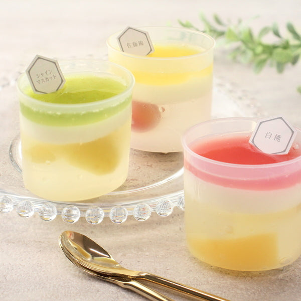 ■山形県産のシャインマスカット、佐藤錦、白桃を使った創作デザート。ごろっと果肉が入ったゼリーにプリンとフルーツジュレを重ねました。銀座フレンチの名店が監修、みずみずしい果物の美味しさを楽しるデザートギフトです。