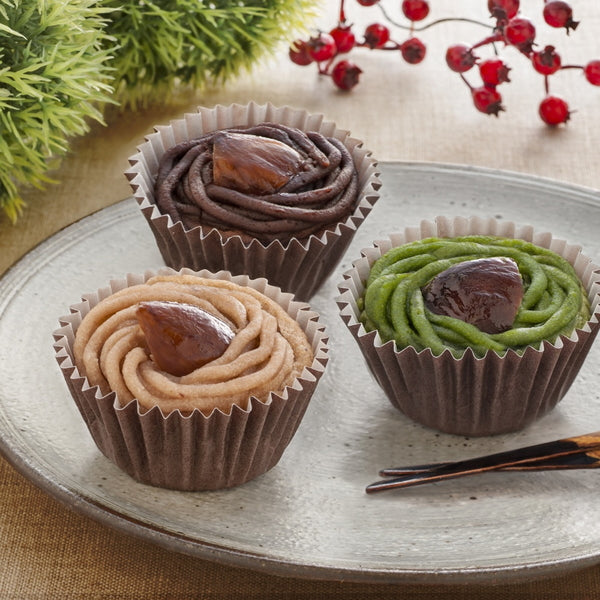 ■しっとりした食感の渋皮栗を使った栗・抹茶・チョコの3種の焼きモンブランです。ほっこりとしたひとときをお過ごしください。