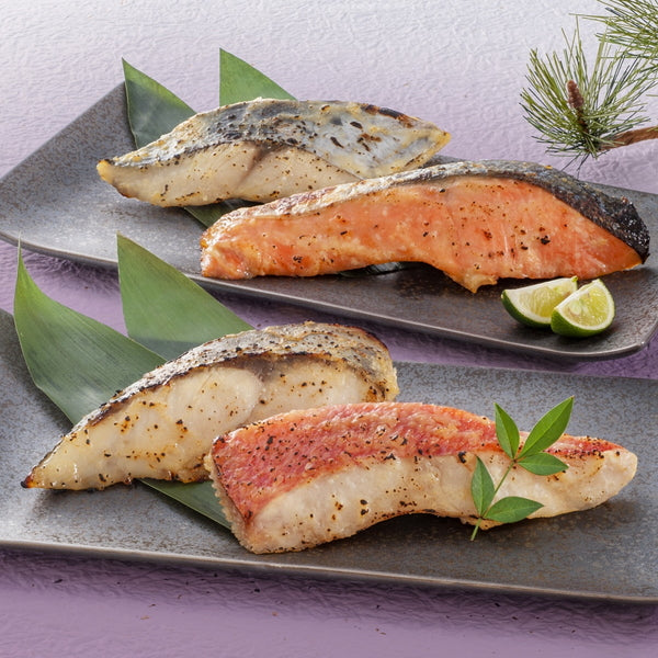 ■商品内容:金目鯛、銀ひらす(ニュージーランド産)・銀鮭(チリ産)・さわら(韓国産)各60g×各2(計8)
