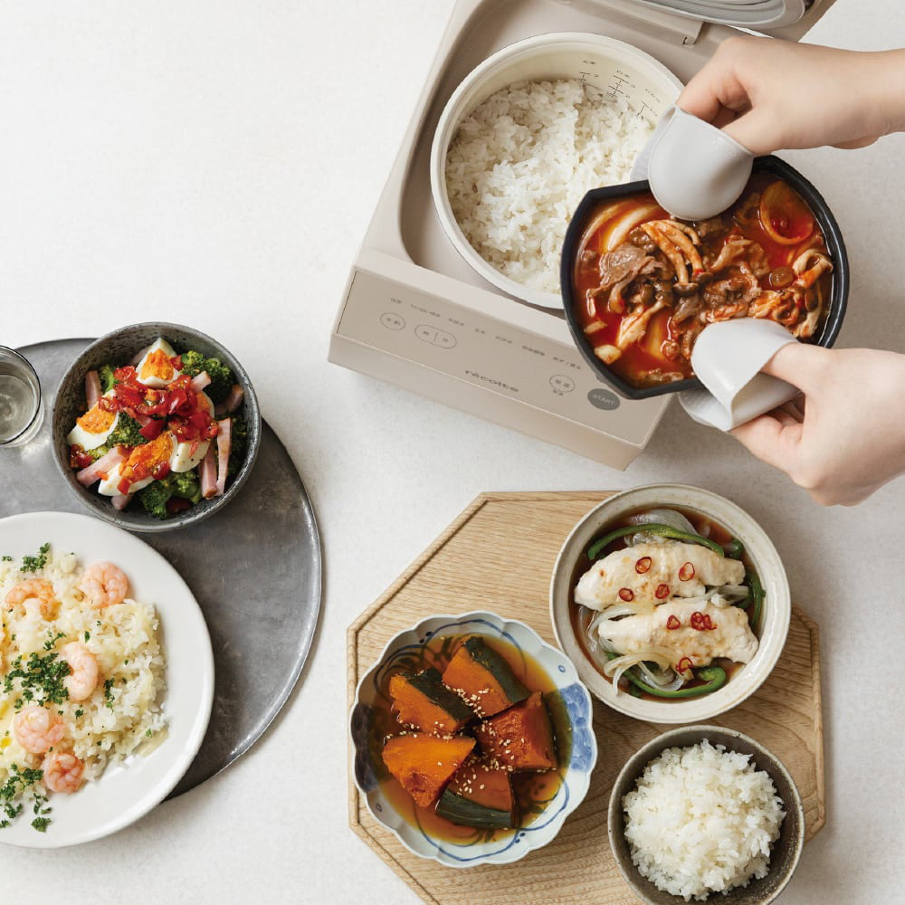 調理トレイを取り出す[シリコンミトン]や、釜の形状にフィットする[しゃもじ]など、便利な付属品も充実。スタイリッシュなフォルムは大人の落ち着いた暮らしにもなじみます。