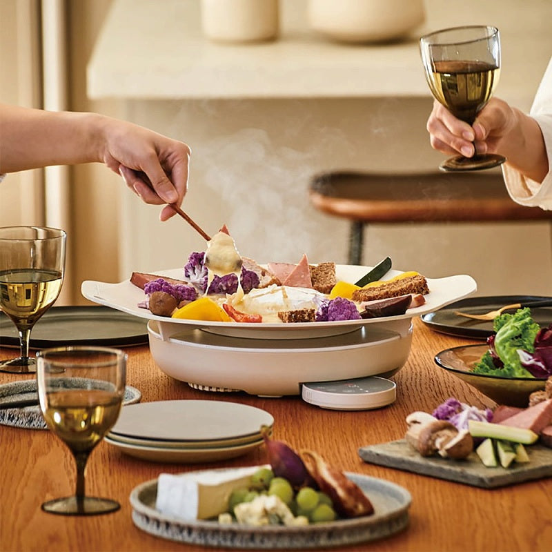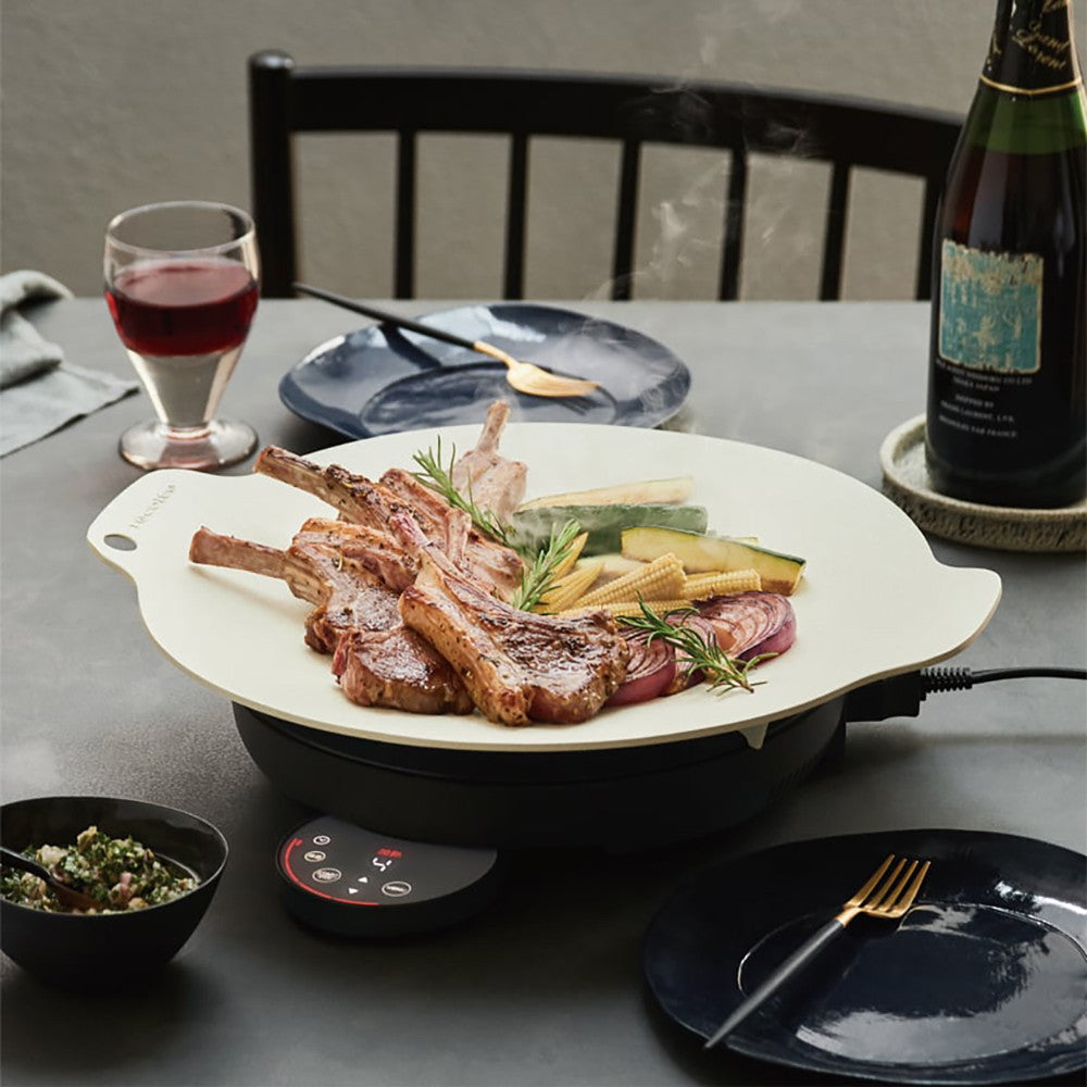 [卓上IHクッキンググリドル]は、新スタイルのホットプレート。調理できる大皿[クッキンググリドルプレート]と円形フォルムの[卓上IHヒーター]をセットにしました。