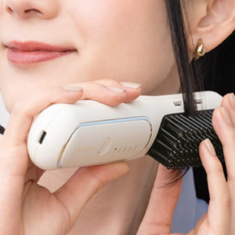使用中、マイナスイオンが連続で発生。パサつきや静電気を抑え、とかすたびにしっとりまとまるしなやかな髪へ。ブラシの両側に吹き出し口があるので、髪にまんべんなく行き渡ります。